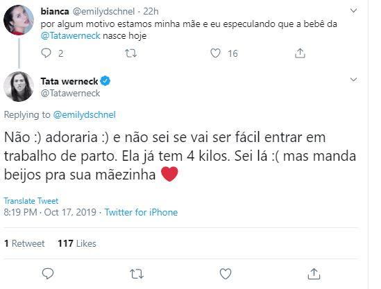 Em resposta à uma fã, Tatá revelou o peso de sua filha. “Por algum motivo, estamos minha mãe e eu especulando que a bebê da Tatá Werneck nasce hoje”, disse a seguidora. Tatá logo esclareceu, negando o nascimento da filha. “Não, adoraria! Não sei se vai ser fácil entrar em trabalho de parto, ela já tem 4 quilos, sei lá”, respondeu a atriz.