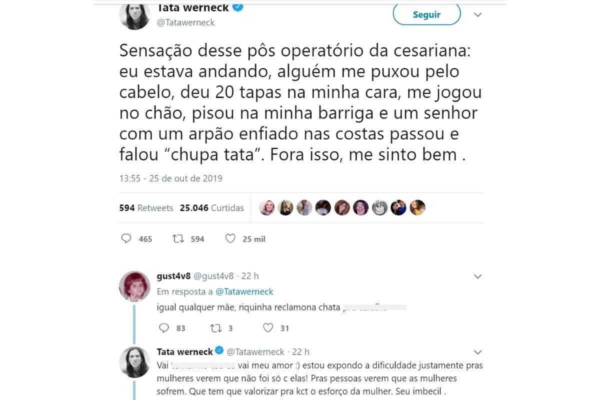 Após sofrer com um diabete gestacional, a apresentadora precisou passar por uma cesariana e assumiu que a recuperação do pós parto não está sendo fácil. No twitter, ela fez um comentário e disse que ainda está sentindo muitas dores. Mas infelizmente, um homem respondeu Tatá sendo agressivo e menosprezando o sofrimento de todas as mães que se recuperam de uma cesárea.