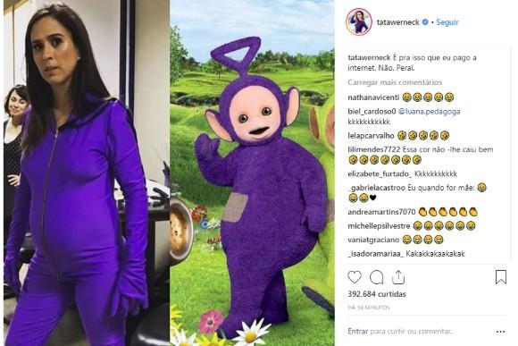 A apresentadora gravava o seu programa quando usou um figurino roxo e notou a semelhança com um dos Teletubbies, Tinky Winky. “É para isso que eu pago a internet. Não. Peraí”, escreveu.