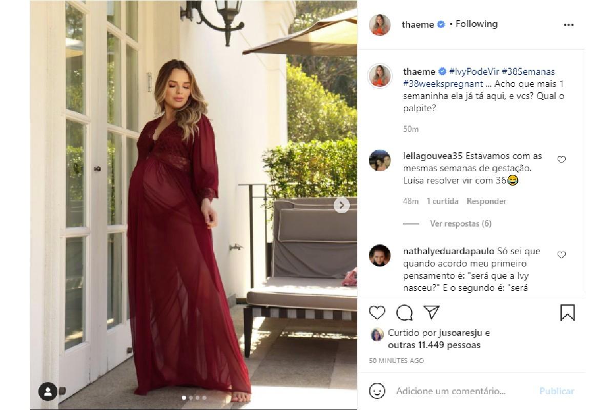 Nesta quarta-feira, 15 de setembro, ela compartilhou algumas fotos no Instagram e escreveu na legenda: “#IvyPodeVir #38Semanas #38weekspregnant… Acho que mais 1 semaninha ela já tá aqui, e vocês? Qual o palpite?”.