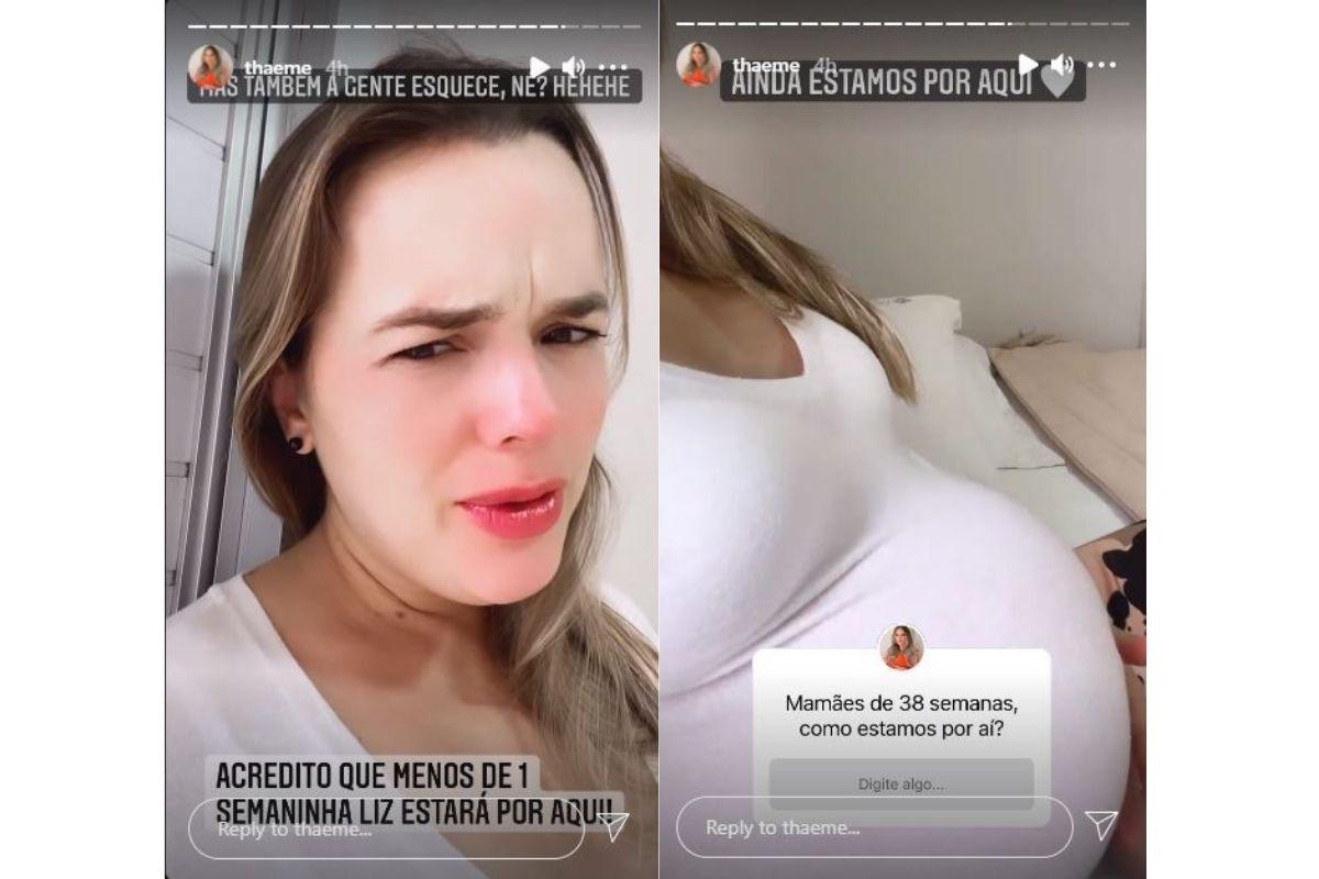 Thaeme postou no perfil do Instagram uma série de desabafos contando como está se sentindo na reta final da gravidez. Ela conta que está tendo dificuldades para dormir devido à dores nas costas, na costela, e cólicas que vêm e vão mas ainda nada de contração.