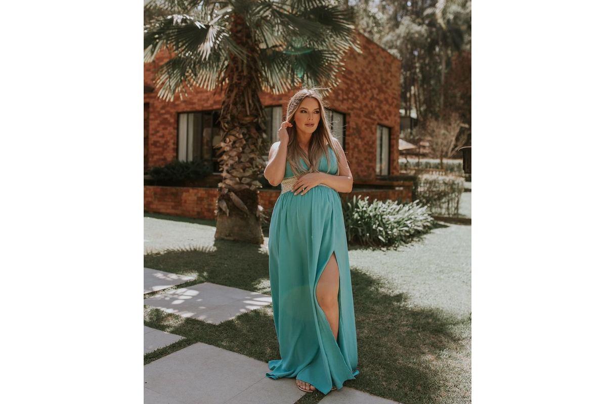 Em uma publicação feita no Instagram, Thaeme mostrou o vestido lindo que está usando nas gravações do vídeo sobre a gravidez de Ivy. Na foto, com vestido na cor azul, ela aparece com as mãos sobre a barriga.