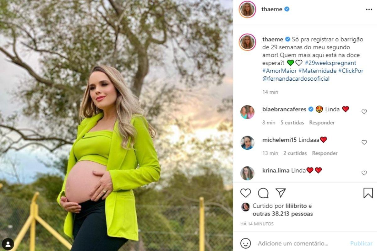 “Só pra registrar o barrigão de 29 semanas do meu segundo amor! Quem mais aqui está na doce espera?!”, escreveu Thaeme ao compartilhar a foto. Na imagem, ela aparece usando um top verde e um blazer. Os internautas amaram a publicação e logo começaram a comentar. “O tanto que eu amooooo”, declarou um fã. “Linda!”, elogiou outra. “Que gravidinha mais linda”, escreveu uma terceira. Veja a publicação abaixo: