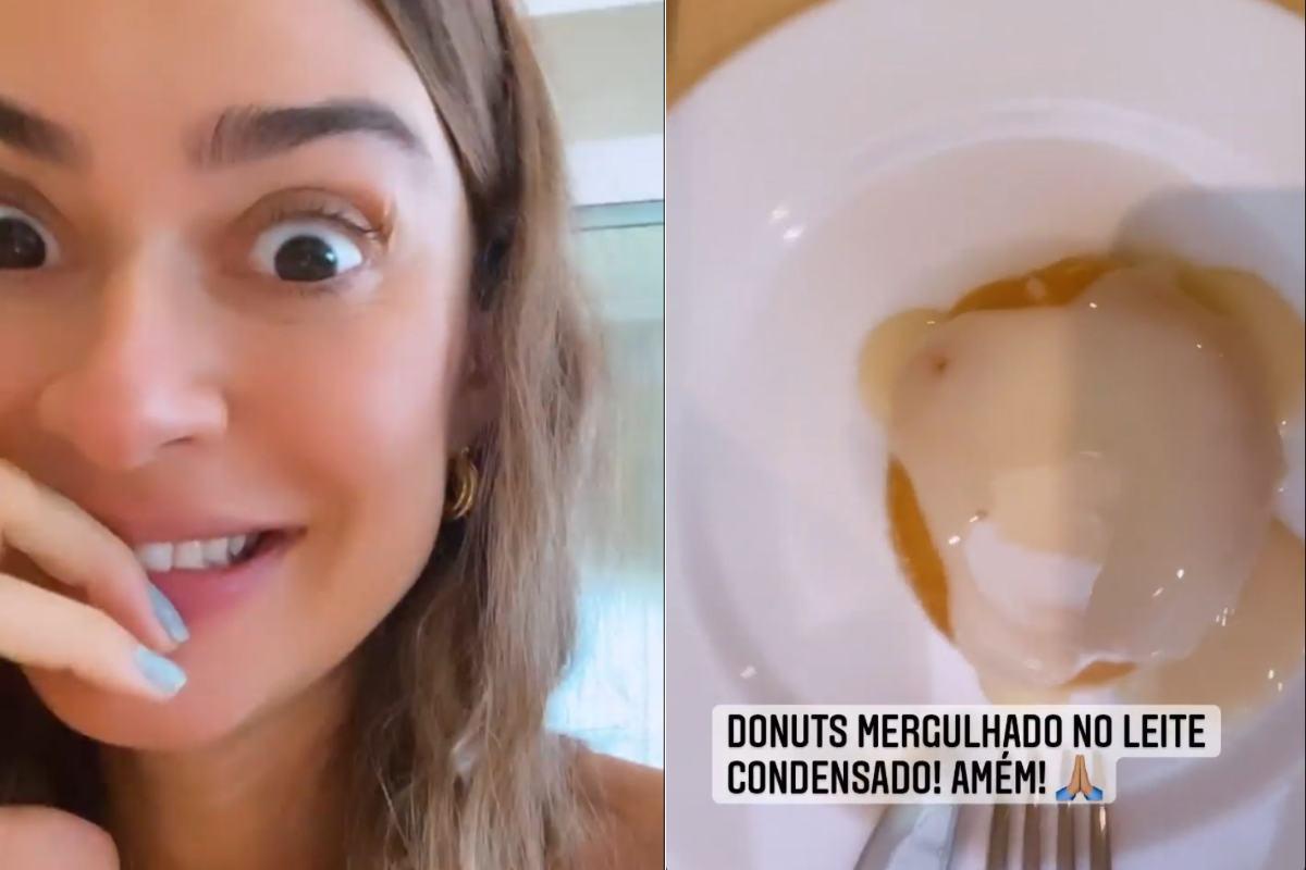 Nos stories do Instagram, Thaila mostrou aos seguidores a sua nova tática para fazer a barriga crescer: Donuts mergulhado no leite condensado. “Amém”, brincou a influenciadora.