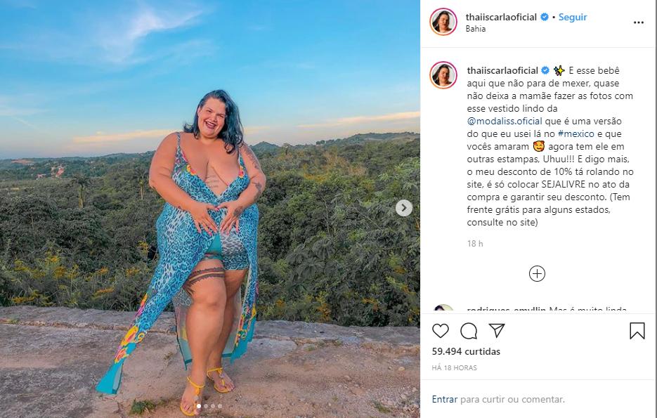 “E esse bebê aqui que não para de mexer, quase não deixa a mamãe fazer as fotos”, brincou Thais na legenda da publicação. Thais Carla está esperando uma menina, que se chamará Eva, fruto de seu relacionamento com Israel Reis. O casal já tem uma filha, chamada Maria Clara.