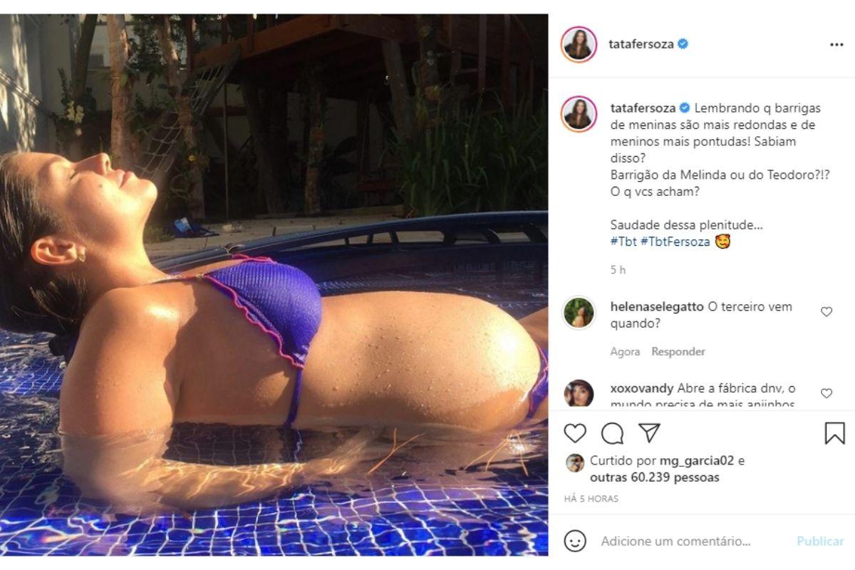 “Lembrando q barrigas de meninas são mais redondas e de meninos mais pontudas! Sabiam disso? Barrigão da Melinda ou do Teodoro?!? O q vcs acham? Saudade dessa plenitude…”, escreveu ela ao compartilhar a imagem. Na foto, ela aparece de biquíni, tomando um banho de piscina. Thais Fersoza é mãe de Melinda e Teodoro, fruto do relacionamento com o cantor Michel Teló.