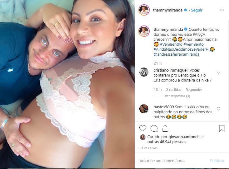 “Quanto tempo você dormiu que não viu essa pança crescer? Amor maior não há!”, escreveu na legenda. Thammy ainda confessou que está indeciso com a escolha do nome do filho. Ele e Andressa escolheram o nome Bento, mas estão indecisos se o nome terá um H ou não, sendo escrito como “Bentho”.