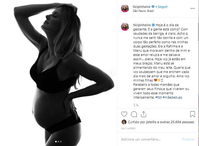 “Hoje é o dia da gestante. E a gente está como? Com saudades da barriga, é claro. Acho que nunca me senti tão bonita e com um corpo tão perfeito como nas minhas duas gestações. Era a Rafinha e a Manu que moravam dentro de mim e esse amor reluzia e me deixava assim… Plena”, disse Ticiane na legenda da publicação.