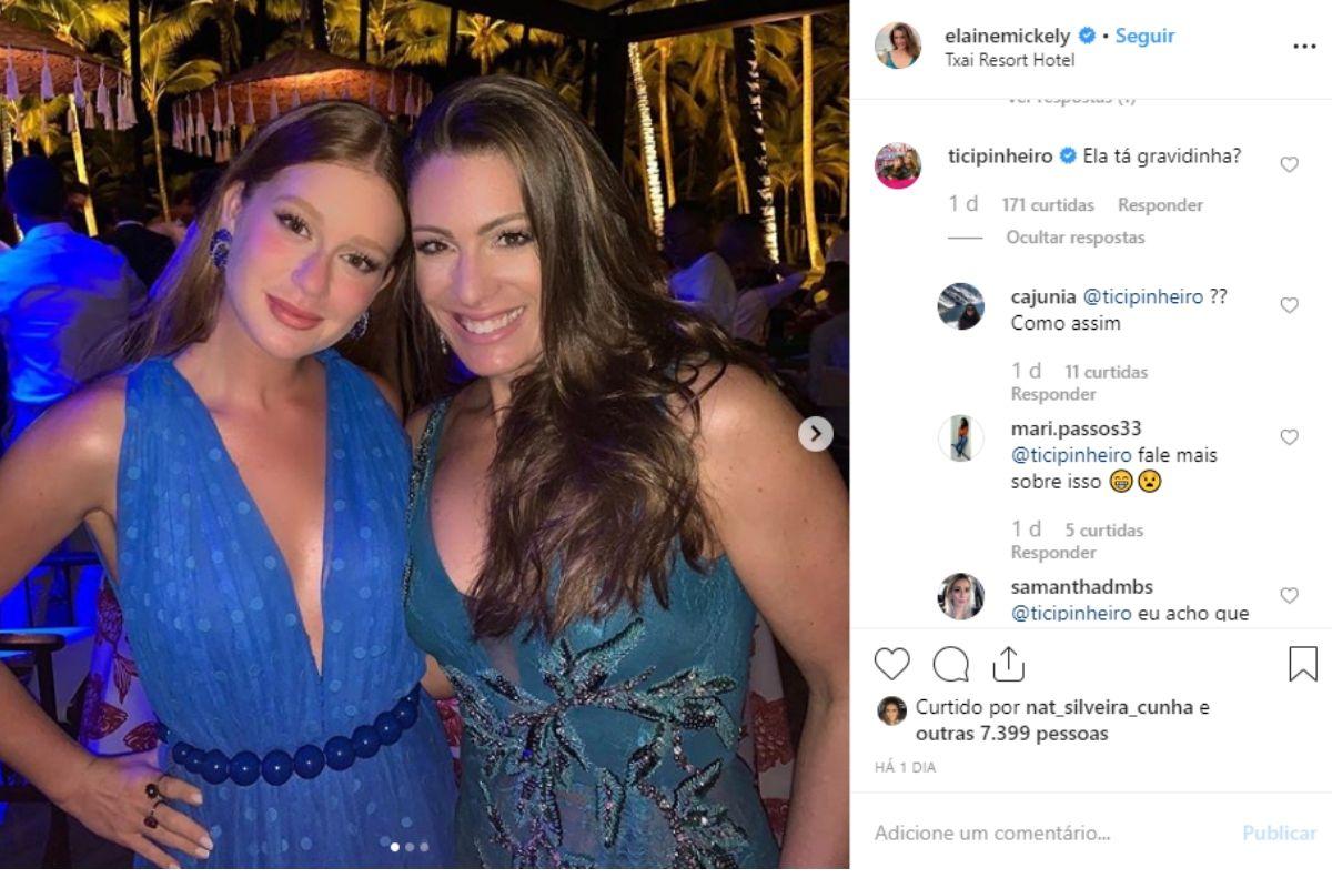 Ticiane Pinheiro, mãe de Rafaella e Manuella, quebrou a internet depois de fazer um comentário curioso na foto da amiga Elaine Mickely, esposa de César Filho. A apresentadora não conseguiu lidar com a curiosidade e resolveu fazer a pergunta que muita gente gostaria de saber a verdadeira reposta: “Marina Ruy Barbosa está grávida?”