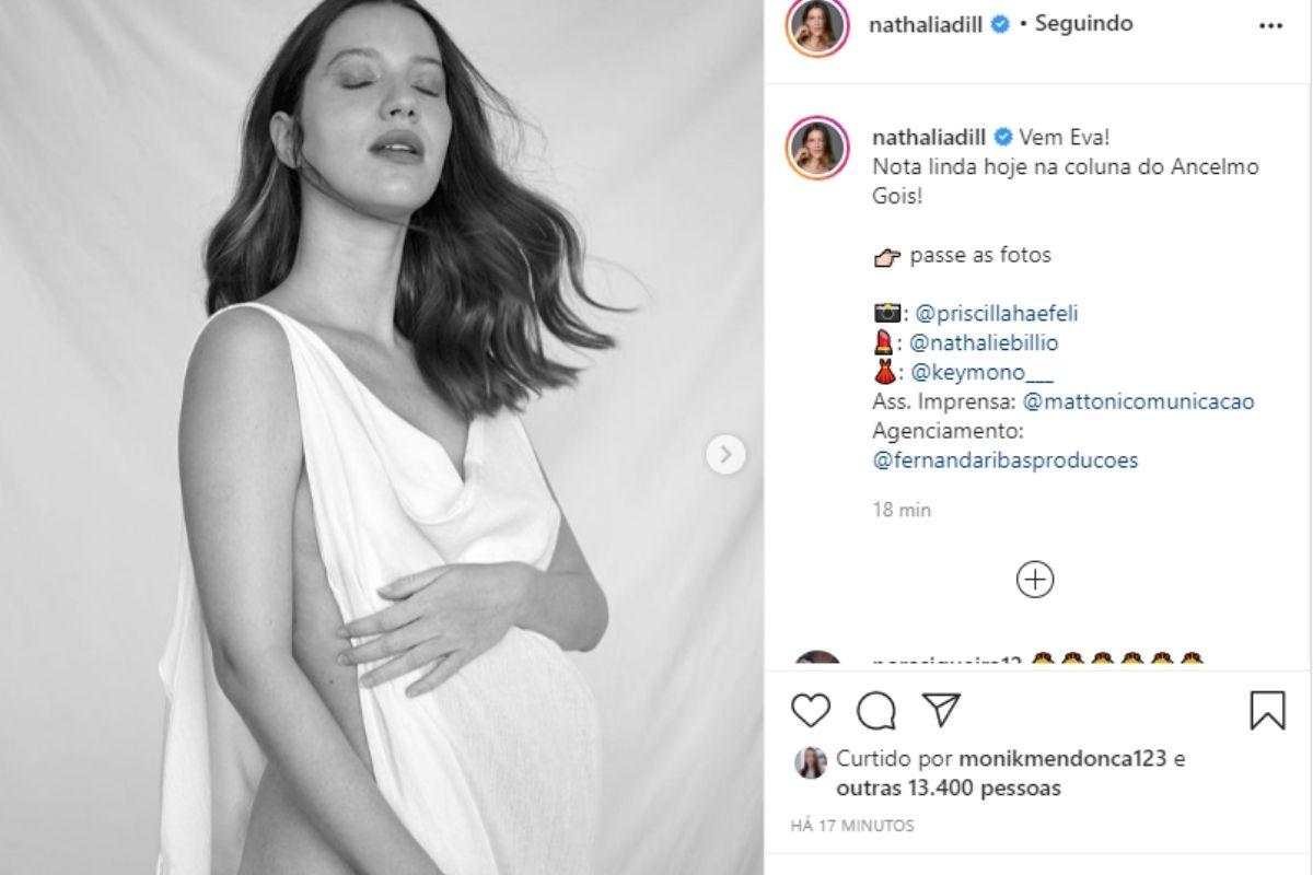 Na reta final da gestação, Nathália Dill impressionou os seguidores nas redes sociais na última segunda-feira, 21 de dezembro, e publicou uma série de fotos onde aparece nua, exibindo a barriga de grávida. No oitavo mês de gestação, a atriz espera pela primeira filha, Eva.