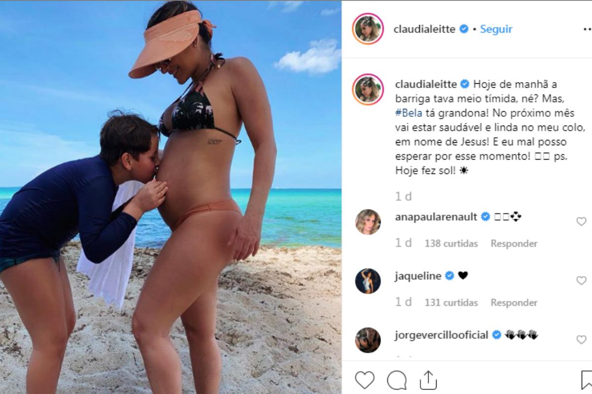 Depois de ter passado o dia na praia, Claudinha estava exibindo a barriga e ainda ganhou um chamego de Davi, que estava dando um beijo na Bella. “Hoje de manhã a barriga tava meio tímida, né? Mas, Bela tá grandona! No próximo mês vai estar saudável e linda no meu colo, em nome de Jesus! E eu mal posso esperar por esse momento! PS. Hoje fez sol”, escreveu na legenda.