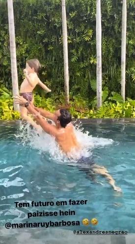 Primeiro, a própria Marina postou em seu storie imagens dele no maior chamego com o afilhado do casal, Eduardo, filho mais novo de Luma Costa.
