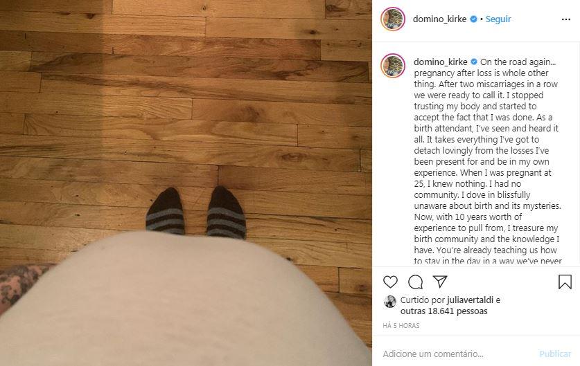 “Quando eu fiquei grávida aos 25 anos, eu não sabia de nada. Eu não tive rede de apoio. Mergulhei alegremente no desconhecido mundo do nascimento e seus mistérios. Agora, com 10 anos de experiência, eu aprecio muito minha rede de apoio e o conhecimento que eu tenho. Você já está nos ensinando como viver um dia de um jeito que nunca vivemos, pequeno. Obrigada”, declarou Domino.