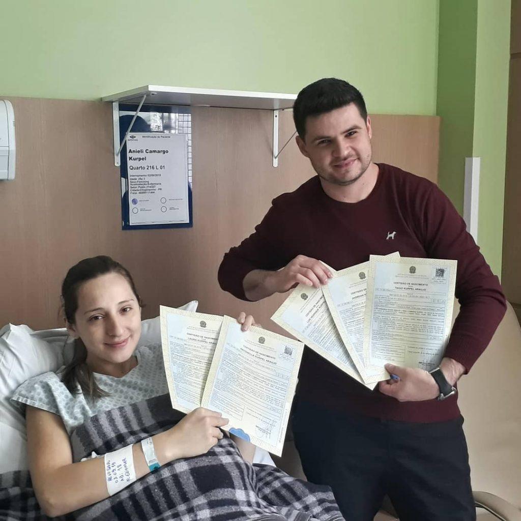 O casal, Anieli Camargo Kurpel e Luis Fernando Araujo, passou por um susto antes de descobrir a gestação, já que os médicos chegaram a desconfiar que ela estava com tumor no ovário. A gravidez aconteceu de maneira natural e os bebês nasceram de 29 semanas.