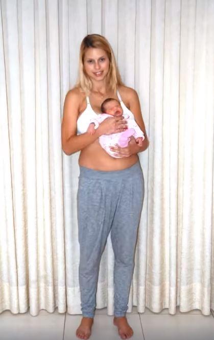 Finalmente, ela mostra sua bolsa estourando e, de uma forma divertida, o marido a leva para o hospital, voltando com a menina recém-nascida nos braços.