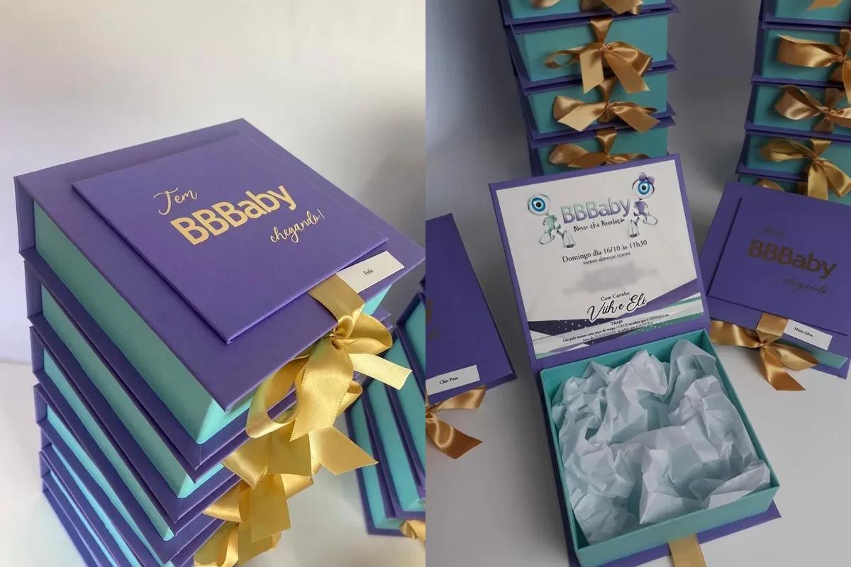 “Estão prontos para o meu chá revelação? Tá chegando! Ainda vai uns chocolatinhos no meu convite do formato de ursinho, mamadeira e chupeta, mamãe tá montando ainda, calma gente!” escreveu a influencer na legenda dos stories. O convite é uma caixa que mescla as cores roxo e azul. Na tampa está escrito: “Tem BBBaby chegando!” em dourado, combinando com o laço. Na parte de dentro do convite, vieram alguns bonecos em referência ao Big Brother Brasil, tem também um pedido aos convidados: “Use pelo menos uma peça de roupa verde se achar que é menino, ou roxo/lilás se achar que é menina”.