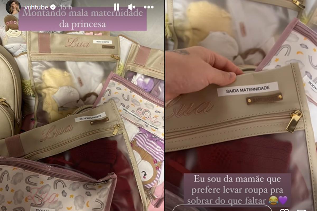 Viih Tube compartilhou que já está com a mala da maternidade preparada.Em seus Stories do Instagram, Viih Tube mostrou que a mala está super organizada, com os pertences da bebê separados por necessidades, como “Saída da Maternidade”, “Body, Macacão e Meias Extras”, “Troca 1”, e etc. “Montando a mala da maternidade da minha princesa”, escreveu.