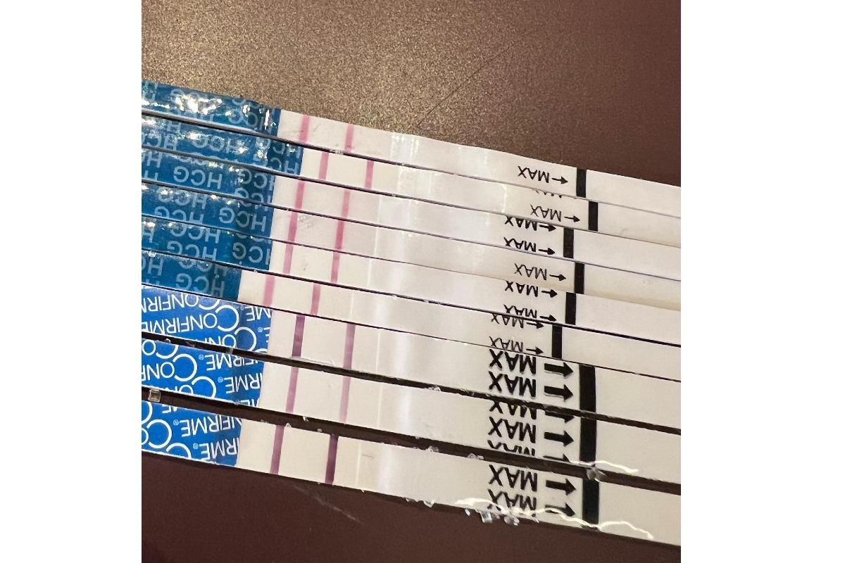 No Instagram, o casal compartilhou em conjunto uma foto da família e ao lado uma foto com 9 testes de gravidez – todos marcando duas barrinhas, ou seja, sinal positivo para gravidez!