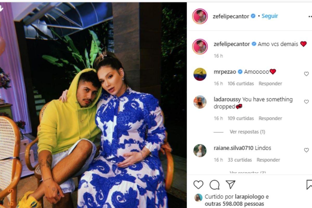 No post, Zé Felipe aparece sentado ao lado de Virginia, que posa com um vestido comprido azul exibindo o barrigão. “Amo vocês demais”, escreveu o filho de Leonardo na legenda da publicação. Diante da declaração, Virgínia logo respondeu e retribui o carinho para o cantor. “Amamos você muitão”, escreveu.