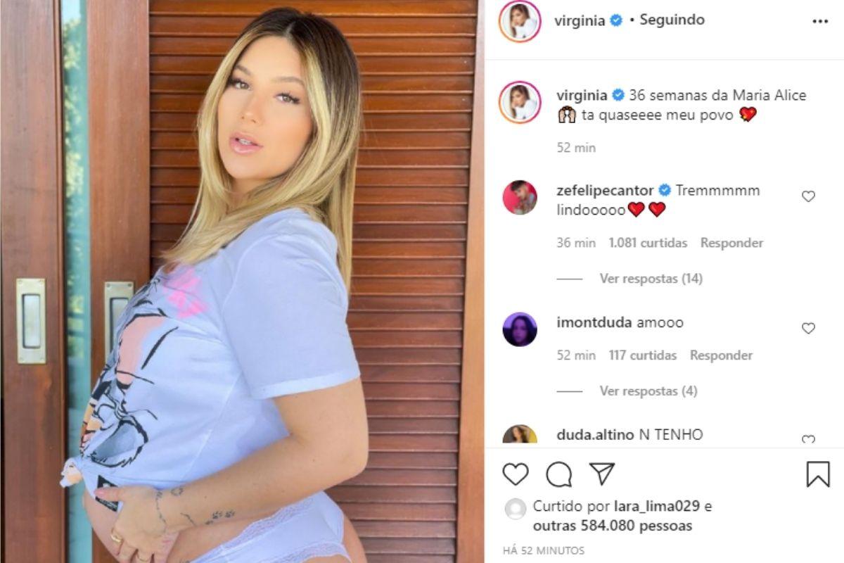 Virgínia espera a primeira filha, Maria Alice, com o cantor Zé Felipe. Nas redes sociais, a mãe de primeira viagem comentou sobre o aumento de peso na gravidez: “Eu me permiti e comi tudo que eu não comia. Eu era neurótica com o corpo. Uns 16 kg a mais, estria por todo corpo, inchaços, dores nos pés, cansaço e muito sono, stress, dores na virilha. Sem posição, peito pesado, xixi toda hora, intestino péssimo. Porém, muito feliz e ansiosa esperando você Maria Alice. Faltam 4 semanas” escreveu na legenda de um post.