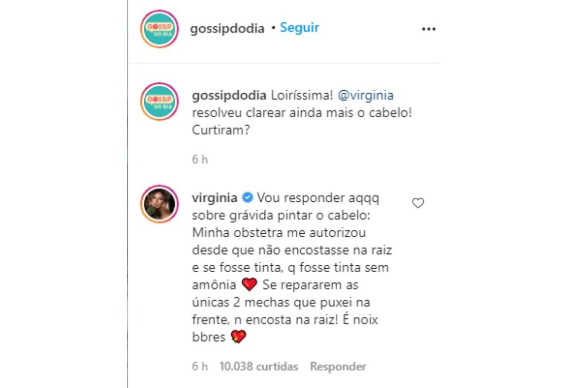 A “polêmica” foi respostada em uma página de notícias do Instagram, a Gossip do Dia, onde a própria Virgínia deixou um comentário dizendo que foi liberada para o procedimento. “Minha obstetra me autorizou desde que não encostasse na raiz e se fosse tinta sem amônia. Se repararem, as únicas duas mexas que puxei na frente não encosta na raiz”, explicou.