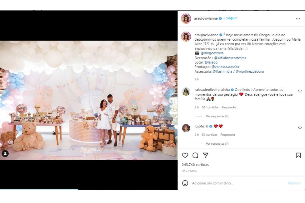 Mais cedo, Viviane ainda chegou a publicar fotos da decoração do chá, sobre as quais escreveu: “É  hoje meus amores!!! Chegou o dia de descobrirmos quem vai completar nossa família . Joaquim ou Maria Alice ???? Já , já eu conto pra vcs !!!! Nossos corações está explodindo de tanta felicidade !!!!”.
