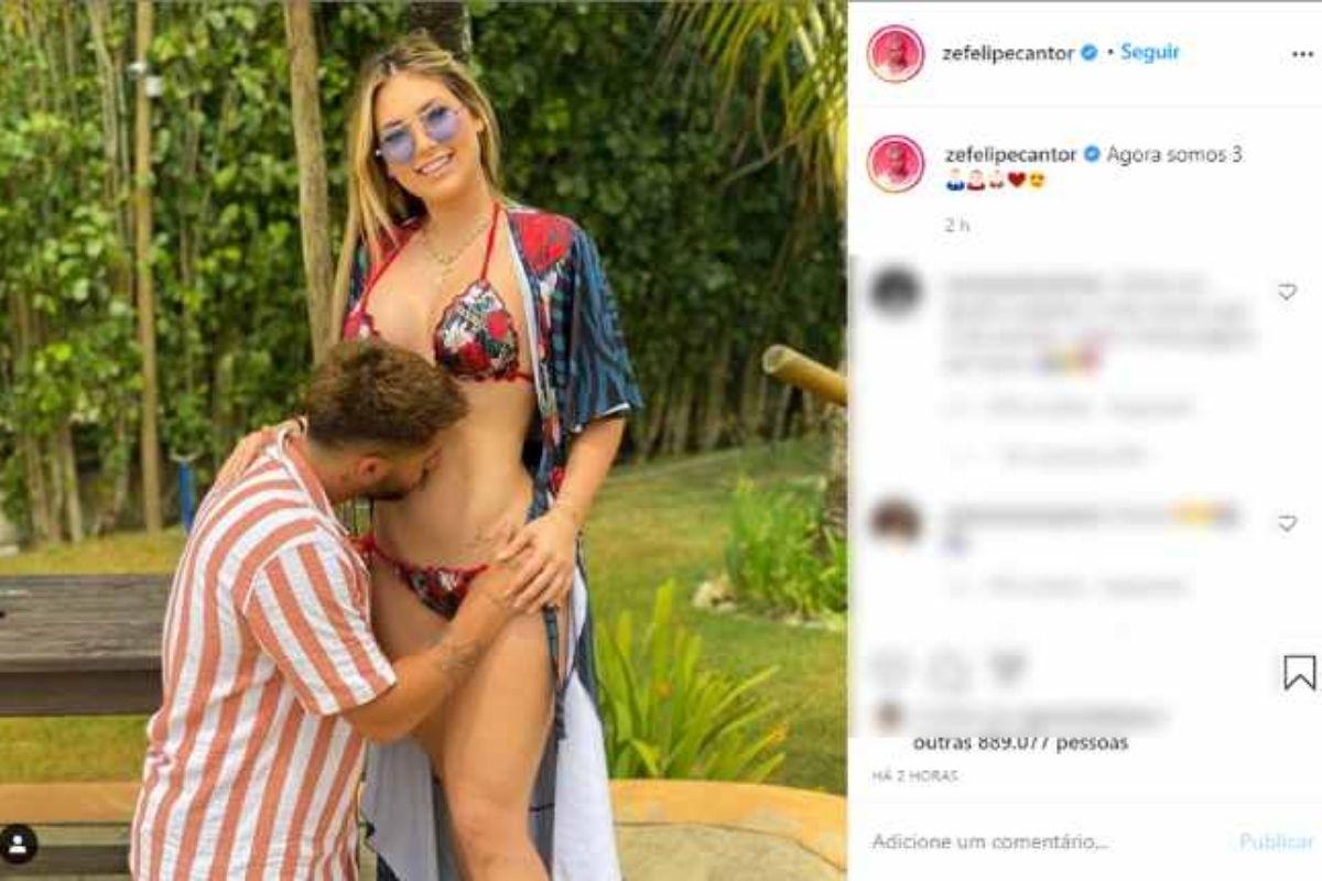 Na imagem publicada o cantor aparece beijando a barriga da amada. “Agora somos 3”, escreveu na legenda. Virgínia também usou o Instagram para dizer: “E agora somos 3… ou melhor, 5 né @zoemariaof @tereusamaria?! Gratidão pela oportunidade de construir uma família ao seu lado @zefelipecantor, amo vocês.”