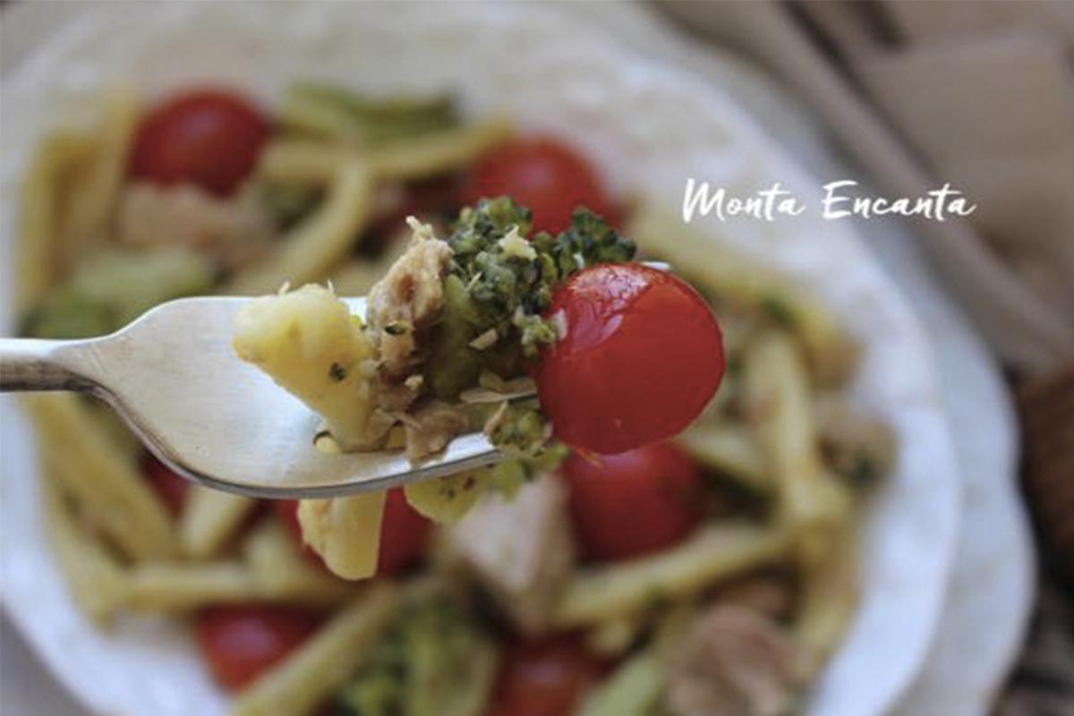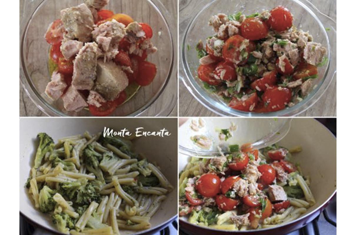 O caserecce entra na panela cru e é cozido como um risoto, com água aos poucos e junto com o brócolis. Com esse método a massa absorve todo o sabor dos temperos, ficando ainda mais gostosa. O tomatinho e o atum ficam para o final e entram juntos no ultimo minuto,. Temperados apenas com azeite e alho cru, que por sinal, o alho ( hum … salivo só de lembrar) empresta um sabor especial a massa. Simples e dos Deuses, vamos cozinhar?