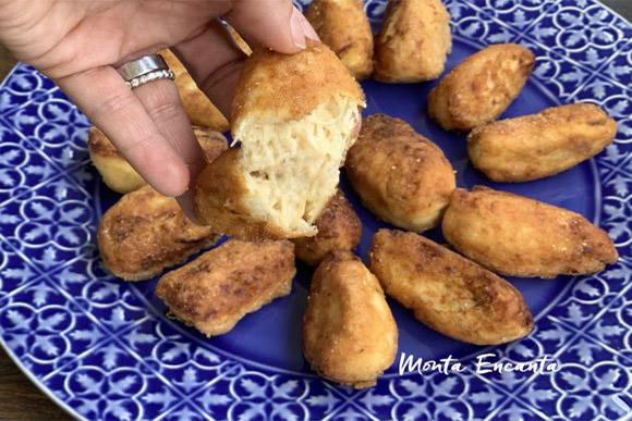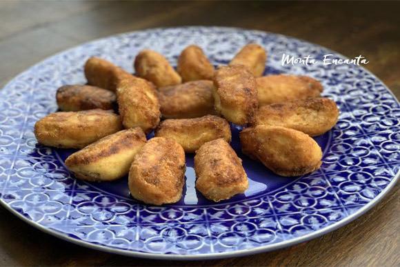 8. Com ajuda de uma colher de sopa pegue uma porção de massa e com as mãos, molde em formato de croquete. Deixe na geladeira até a hora de fritar, coberto com plástico filme.