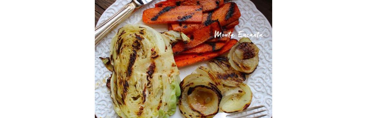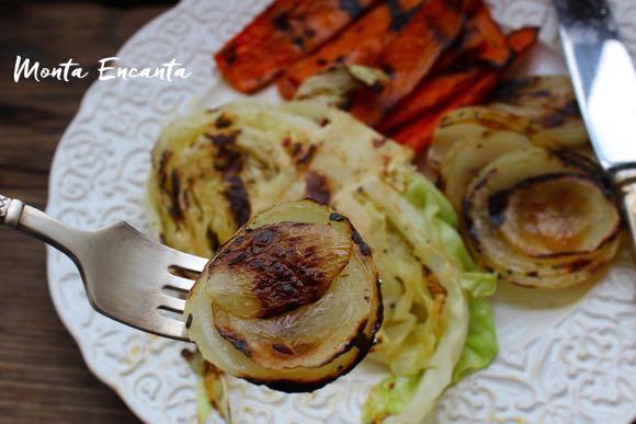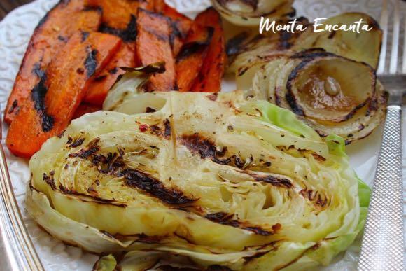 Primeiro, os legumes vão para chapa quente e untada com um fio de azeite, até grelhar e até os vegetais cozinharem, ficando tostadinhos por fora e macios por dentro mas ainda al dente. Depois, na hora ‘H’ de servir, eles são temperados com azeite e vinagre, (como uma salada). E o resultado surpreende de tão gostoso! Nesse dia eu fiz com fatias de repolho, cebola e cenoura, por que era o que eu tinha na geladeira e uau .. A cebola carameliza e empresta um realce de sabor surreal de bom.
