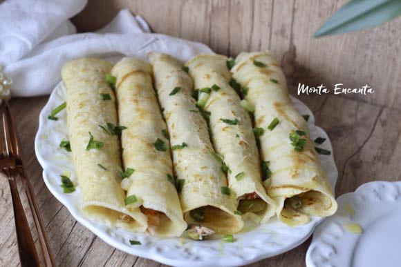 MONTAGEM: Coloque cerca de 1 e 1/2 colheres de sopa rasa do recheio na ponta da última panqueca da pilha. Enrole pressionando para que o recheio fique firme. Finalmente transfira para um refratário grande e repita o procedimento com os outros discos de panqueca.