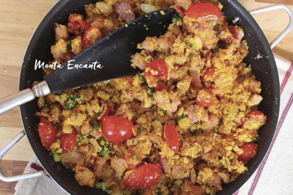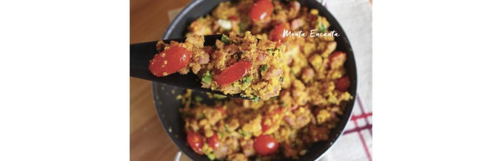 A de hoje é feita com farinha de milho,  manteiga e linguiça calabresa fresca. Deliciosa, prática e bem rapidinha de fazer. Com a farofa de milho comprada pronta, pá pum mesmo! Basta  soltar a carne da linguiça da pele, dourar na manteiga, temperar e acrescer a farofa pronta. Depois é tostar alguns minutos em fogo baixo para deixar crocante.