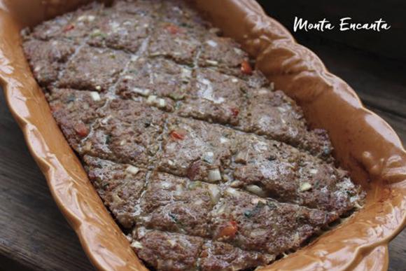 Em um refratário que vá ao forno, coloque metade da carne, recheio com queijo muzarela e 4 queijos polegues cortados ao meio no sentido da largura. Cubra com o restante da carne. Molde com uma faca os losangos do quibe e leve ao forno médio por 30minutos.