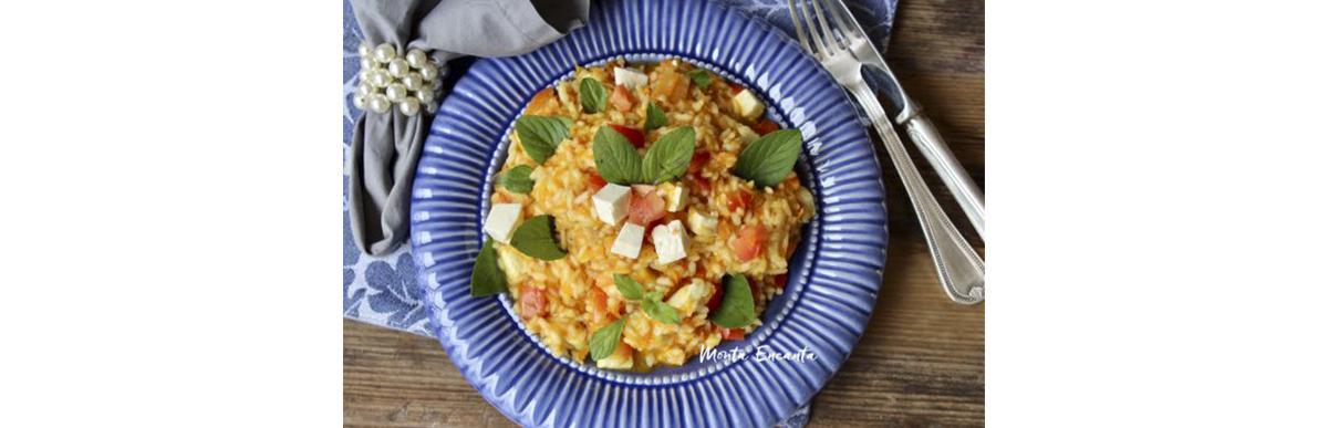 É divino! Cremoso, com grãos al dente,  leva fundo de legumes, tomate italiano, cubos de queijo fresco  e folhas de manjericão quando com o está risoto pronto.