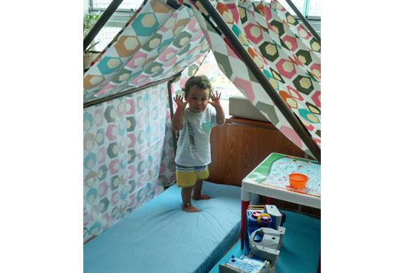 Outro dia ele quis montar uma cabana na sala. Olhamos na internet, fomos na loja de material de construção, compramos tecido e tubos de PVC. Construímos uma casa-cabana na sala que ficou mais de um mês montada!