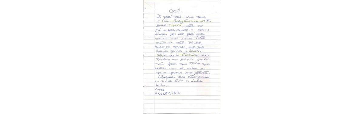 Em São Paulo, a campanha termina no dia 16 de dezembro, amanhã, e ainda dá tempo de ajudar. Clique aqui para saber qual a data limite na sua cidade e escolher uma unidade. O Brasil Post entrou nesta corrente do bem e, abaixo, estão 11 cartinhas de crianças que cada um dos repórteres “adotou” e que vão balançar o seu coração: