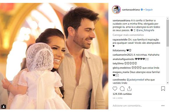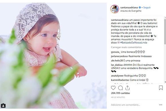“Um passo importante foi dado em sua vida,filha! ? O seu batismo! Pedimos a papai do céu que te abençoe e proteja durante toda a a sua! Você é a bonequinha de porcelana da vida da mamãe, do papai e do irmãozinho! ? Te amamos muuuiito!!! Nunca se esqueça disso!!!”, ela escreveu na legenda. A cerimônia aconteceu na Arautos do Evangelho no último domingo (09).