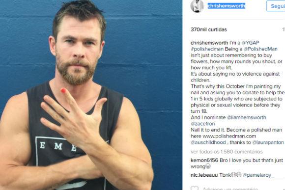 Na foto do Instagram, Chris aparece com a unha do dedo indicador pintada de vermelho. Ele pede doações na legenda e lembra sobre as estatísticas alarmantes: no mundo, uma em cada cinco crianças vai sofrer algum tipo violência antes de chegar aos 18 anos.