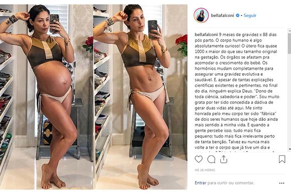 Bella Falconi deu à luz Stella, sua caçula, há quase três meses. A influenciadora, que é conhecida por exibir corpo sarado, já começou a se recuperar da sua segunda gestação. Em foto compartilhada no Instagram, Bella compara o antes e o depois de biquíni – com a barriga de 9 meses e atualmente. “O corpo humano é algo absolutamente curioso! O útero fica quase 1000 x maior do que seu tamanho original na gestação. Os órgãos se afastam pra acomodar o crescimento do bebê. Os hormônios mudam completamente para assegurar uma gravidez evolutiva e saudável”, ela escreveu em um trecho da legenda.