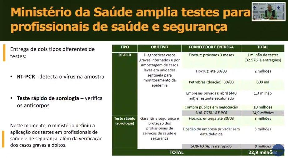 Os dois testes que vão ser usados pelo sistema de saúde brasileiro é o RT-PCR, o tipo que reconhece o vírus por uma amostra feita por um cotonete, e um de maior rapidez de sorologia, que é feito pela verificação dos anticorpos que se modificam quando estão na presença do vírus.