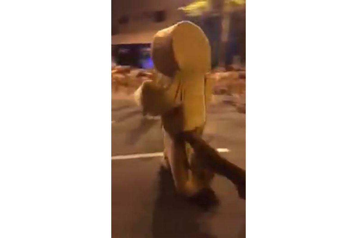 No vídeo, ele corre atrás do primeiro homem fantasiado e depois outros dois tentam ajudar o amigo, mas o filhote também os persegue. O registro divertidíssimo, tem mais de 3, 5 milhões de visualizações no Twitter e quase 200 mil curtidas, sem contar os 64 mil retweets.