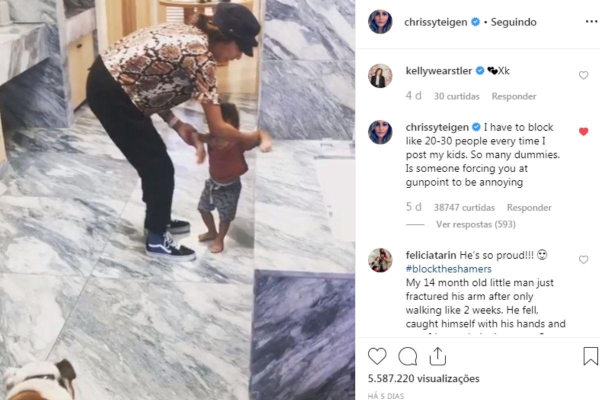 Chrissy não deixou a situação passar em branco. “Eu tenho que bloquear, tipo, 20 a 30 pessoas toda a vez que eu posto as minhas crianças. Alguém está com uma arma te forçando a ser irritante?”, postou em sua rede social, alcançando mais de 38 mil curtidas.