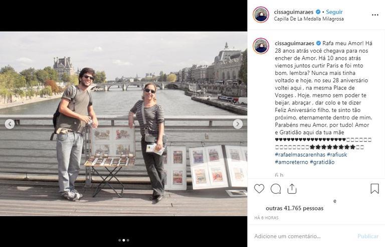 Cissa ainda fez questão de relembrar a saudade que sente de Rafael, falecido há 9 anos: “Hoje, mesmo sem poder te beijar, abraçar, dar colo e te dizer Feliz Aniversário filho, te sinto tão próximo, eternamente dentro de mim. Parabéns meu Amor, por tudo! Amor e Gratidão aqui da tua mãe”.