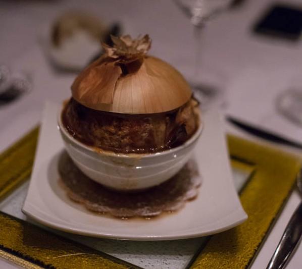 Sopa de cebola servida com o topo da cebola em cima! Ficamos encantados!