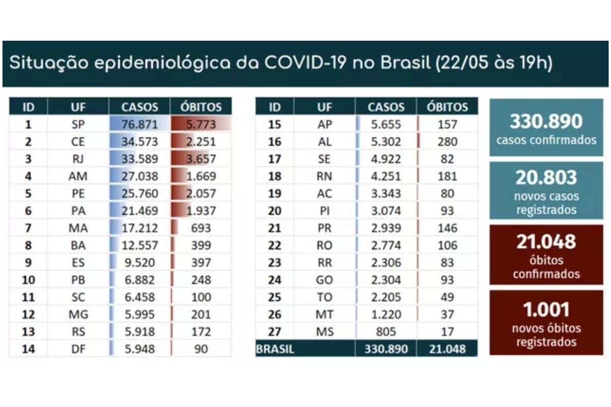 No dia 9 de maio, o Brasil havia atingido o marco de 10 mil óbitos por covid-19 e apenas em um intervalo de 12 dias, este número dobrou. Em São Paulo, estado com mais pessoas contaminadas, já são 76.871 casos, seguido pelo Ceará, com 34.573 e Rio de Janeiro, com 33.589.