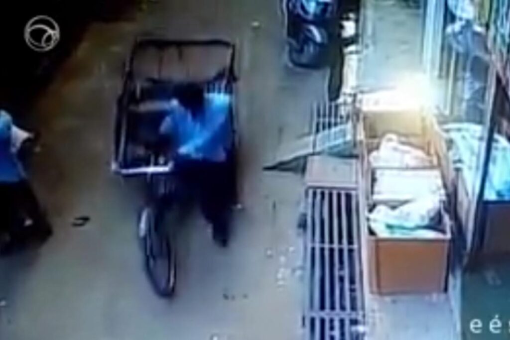 Depois da queda, o homem que estava conduzindo o riquixá olha para trás e tentando entender o que tinha acontecido. Os pedestres que presenciaram a queda foram ajudar o menino que foi encaminhado para o hospital e está bem.