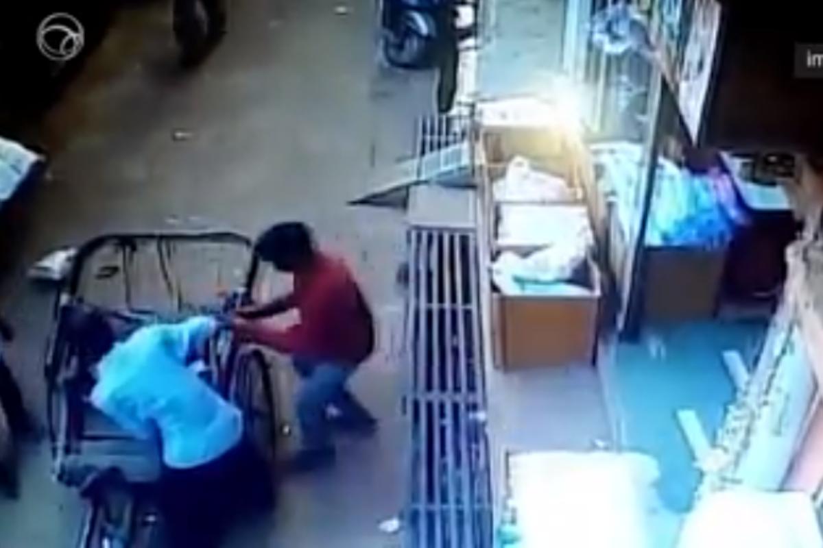 Uma criança de 3 anos foi salva por um carrinho muito popular na Índia! No exato momento que o menino cai do prédio, o riquixá estava sendo puxado por uma pessoa para transportar outras e salvou a vida do menino!