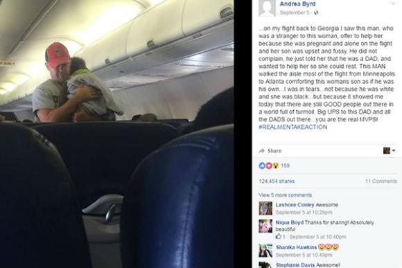 “Ele não reclamou, ele apenas disse que ele era um pai e gostaria de ajudá-la para que ela descansasse“, esclareceu a passageira. “Este homem andou pelos corredores do avião durante todo o voo entre Minneapolis e Atlanta, confortando o filho da mulher como se fosse seu próprio filho“, disse. “Eu estava chorando, não por que ele era branco e ela negra, mas porque isso mostra que ainda existem boas pessoas num mundo cheio de turbulências. Parabéns para esse pai“, concluiu o relato.