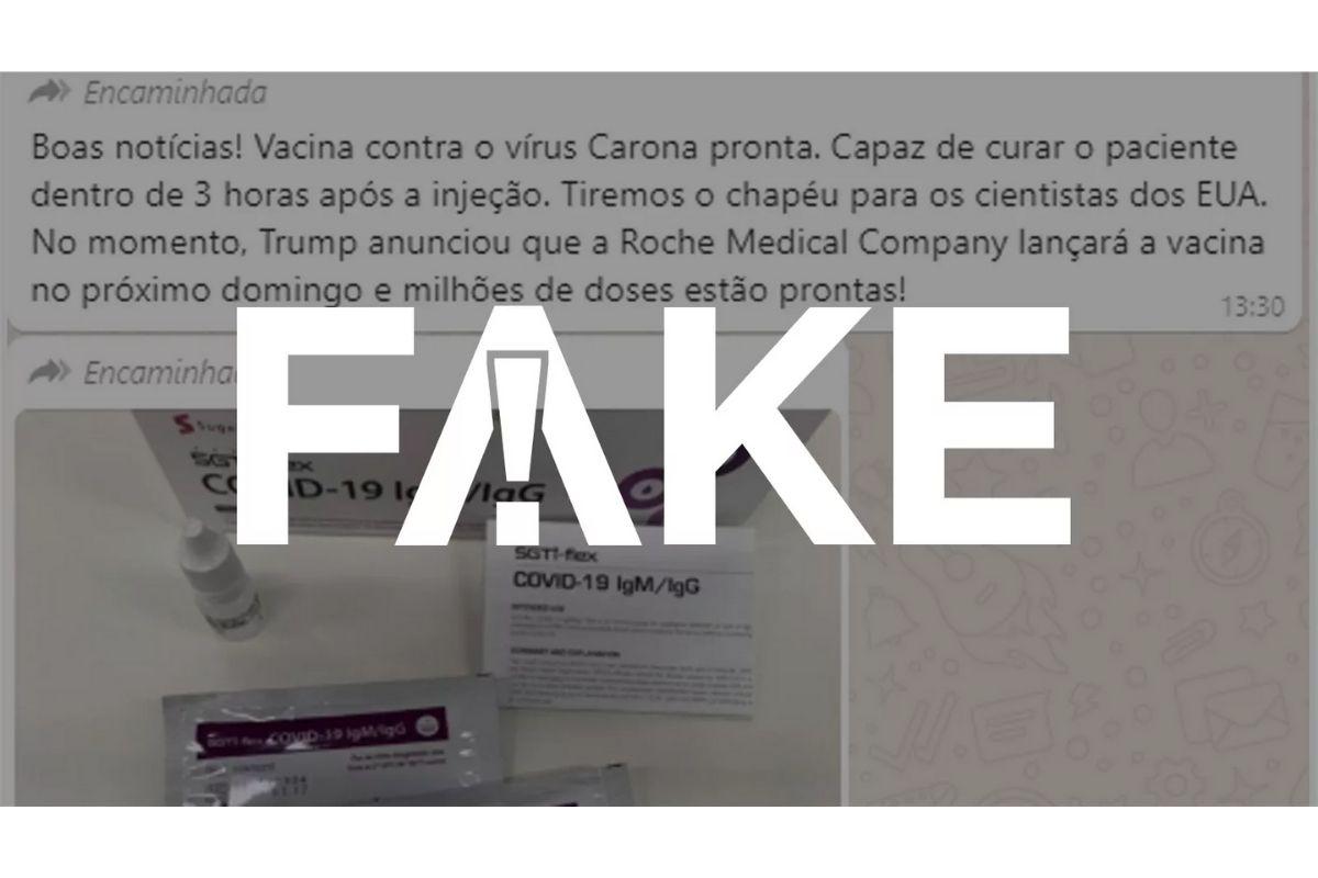 “A imagem que está sendo compartilhada é de um kit de diagnóstico. Não só não existe vacina ainda, mas também não há perspectiva de que tenhamos uma à disposição da população no próximo um ano e meio. Várias plataformas estão correndo contra o tempo para chegar a uma vacina. Mas, neste momento, a única medida que podemos tomar é ter higiene, cumprir o isolamento e evitar a propagação do vírus“, explicou o infectologista Renato Kfouri, presidente do Departamento Científico de Imunizações da Sociedade Brasileira de Pediatria, à CBN.
