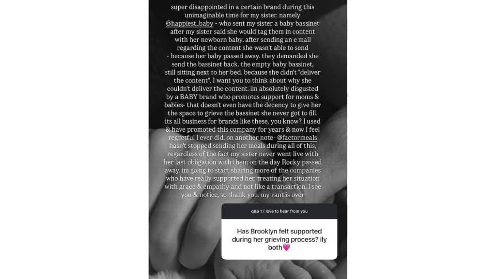 A repercussão negativa começou quando Kenna Bangerter, irmã de Brooklyn, fez um desabafo no Instagram. Em um post emocionante, ela expressou seu descontentamento com a atitude da empresa, que não teria considerado o momento delicado vivido pela influenciadora. “A @happiest_baby entregou um berço para minha irmã, para ela marcá-los em seu conteúdo com seu bebê recém-nascido. Depois de um e-mail questionado sobre o conteúdo que ela não pôde entregar — porque seu bebê faleceu — eles exigiram a devolução do berço. O berço está vazio, ainda ao lado da cama dela”, escreveu Kenna, deixando claro seu repúdio à falta de sensibilidade da empresa.